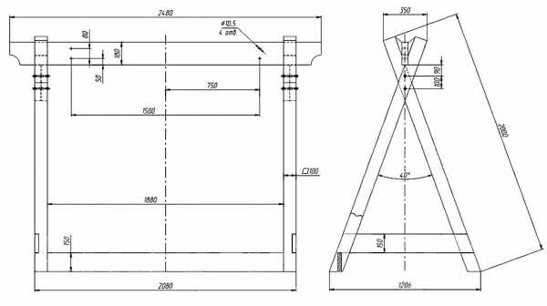 Опоры желательно делать в виде буквы «А». Из древесины прочной и без больших сучков. Здесь будут уместны струганные брусья или доски толщиной не менее 50 мм. Все детали опоры соединяются саморезами диаметром 8-10 мм. Те же требования касаются и перекладины.