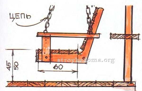 Подобные качели трудно сделать без чертежа. Взрослые — это не дети, у них и вес больше, и желания разные. Поэтому расчет качелей для взрослых надо производить от сидения. Если оно одноместное, то и расчет нагрузок будет меньше. Для многоместных качелей потребуются другие расчеты.