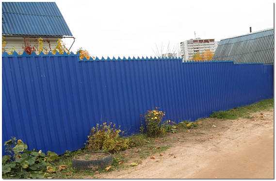 - Забор, в отличие от ограждения из штакетника, получается сплошным, то есть полностью скрывающим из поля зрения посторонних людей всё происходящее во дворе. При этом высоту забора хозяин волен выбрать самостоятельно (безусловно, в разумных пределах), так как профилированный лист можно заказать любой длины.
