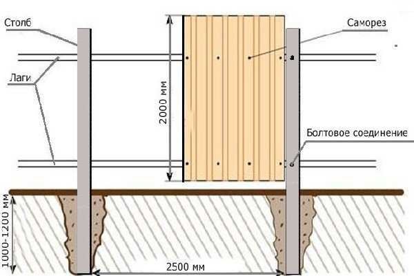 Количество лаг определяется исходя из периметра участка. Если высота забора не превышает двух метров, то лаги устанавливаются в два ряда, в противном случае необходимо три ряда лаг. Саморезов необходимо будет с расчетом 6 или 9 штук на один лист зависимо от количества лаг.