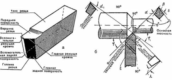 Головка резца имеет 2 поверхности: переднюю, отводящую стружку, и задние стороны, обращенные к детали и разделяемые на основные и вспомогательные. Это же относится к режущим кромкам, главная из которых образуется при пересечении передней поверхности и задней основной. Углы их заточки определяют назначение резца и считаются важной характеристикой: в зависимости от месторасположения они разделяются на заострения, задние главные и такие же передние, их сумма с отклонениями от соответствующей оси резания всегда равняется 90°. Конструкцию рабочей головки резца также определяют углы между плоскостью обработки и передней поверхностью, проекциями кромок, направлением подачи и отображением главной линии реза.