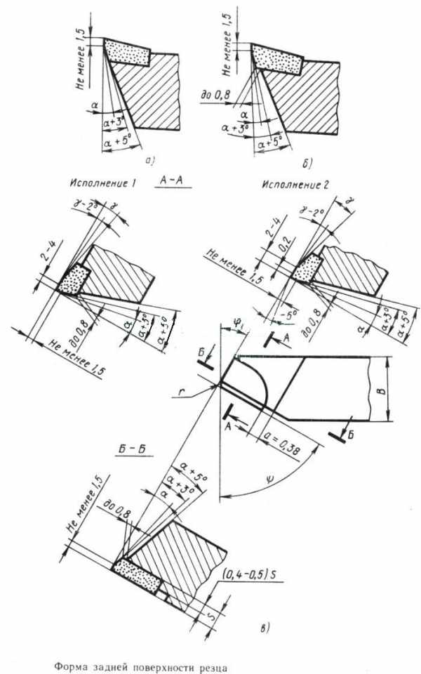 На рисунке (а) указана задняя поверхность с одной плоскостью заточки, на рисунке (б) – с несколькими. При напайке твердосплавных пластин задняя поверхность имеет три плоскости: