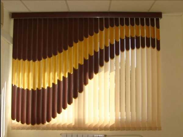 - Наклонные. Это решение проблемы зашторивания окон необычной формы. Наклонные вертикальные жалюзи изготавливаются по индивидуальным замерам с разновеликой длиной пластин из пластика или ткани. Тканевые больше подходят для помещений, в которых нет необходимости полностью блокировать естественный свет, а пластиковые пригодятся там, где желательна полная темнота.