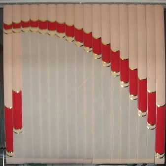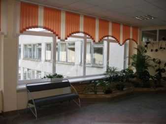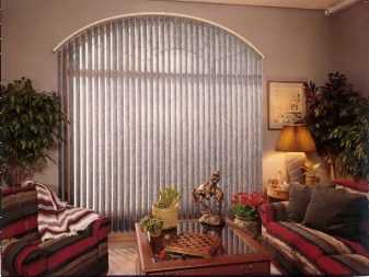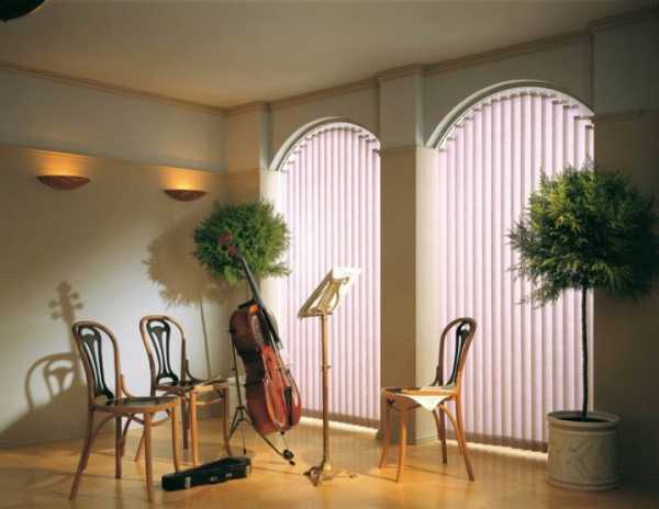 - Арочные. Вертикальные арочные жалюзи – это полотно из ламелей, которое как шторы закрывает все пространство от карниза до пола, имея при этом разную длину пластин, или по типу ламбрекена прикрывает лишь верхнюю часть окна. Возможна цветная комбинация этих вариантов. Особенности конструкции заключаются в гибкости карниза, профиль которого способен принимать нужную форму с углами до 55 градусов относительно горизонтальной линии. При своей гибкости он имеет специальные ребра жесткости, которые держат форму и обеспечивают надежность эксплуатации. Декоративный карниз в конструкции отсутствует.