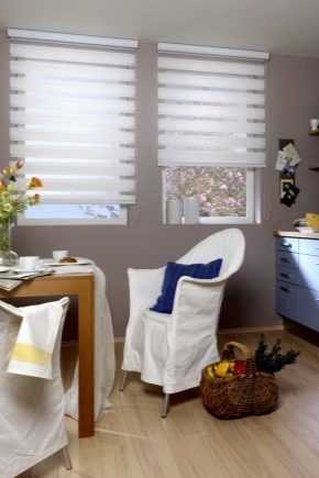Тканевые двухцветные жалюзи «день-ночь» идеально подойдут как для спален, так и для гостиных. В полусобранном виде хорошо видно, что часть таких горизонтальных штор – это прозрачные ламели, которые пропускают свет, в закрытом же виде такие жалюзи очень плотные и практически не пропускают свет. Выполненные в более нейтральной цветовой гамме, они идеально подойдут и для рабочего кабинета, и для кухни. По сути, именно эти шторы имеют универсальное предназначение.