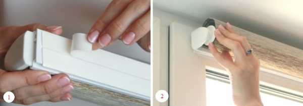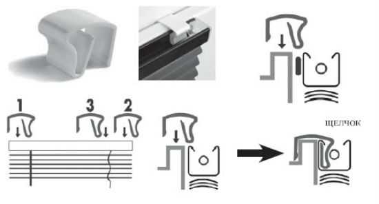 - Направляющий элемент освобождают от пленки и вставляют шторы под крышку. При этом их необходимо плотно прижать штапиком.