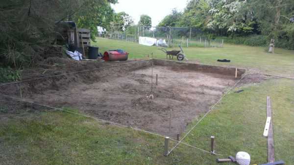 Π¨Π°Π³ 1. ΠΠΎΠ΄Π³ΠΎΡΠΎΠ²ΠΊΠ° ΡΡΠ°ΡΡΠΊΠ° Π΄Π»Ρ ΡΡΡΠΎΠΈΡΠ΅Π»ΡΡΡΠ²Π°. ΠΡΠ±ΡΠ°Π½Π½ΡΠΉ ΡΡΠ°ΡΡΠΎΠΊ Π·Π΅ΠΌΠ»ΠΈ ΡΠ»Π΅Π΄ΡΠ΅Ρ ΠΎΡΠ²ΠΎΠ±ΠΎΠ΄ΠΈΡΡ ΠΎΡ ΠΏΠ»ΠΎΠ΄ΠΎΡΠΎΠ΄Π½ΠΎΠ³ΠΎ ΡΠ»ΠΎΡ ΠΏΠΎΡΠ²Ρ. ΠΠ»Ρ Π½Π°ΡΠ°Π»Π°, ΡΠ»Π΅Π΄ΡΠ΅Ρ ΡΠ°Π·ΠΌΠ΅ΡΠΈΡΡ Π³Π°Π±Π°ΡΠΈΡΡ Π±ΡΠ΄ΡΡΠ΅Π³ΠΎ ΡΡΡΠΎΠ΅Π½ΠΈΡ. ΠΠ»Ρ ΡΡΠΎΠ³ΠΎ ΠΏΠΎΠ½Π°Π΄ΠΎΠ±ΡΡΡΡ ΠΊΠΎΠ»ΡΡ ΠΈ Π²Π΅ΡΠ΅Π²ΠΊΠ°. ΠΠΎΠ»ΡΡΠΊΠΈ Π·Π°Π±ΠΈΠ²Π°ΡΡΡΡ ΠΏΠΎ ΡΠ³Π»Π°ΠΌ ΠΏΠ»Π°Π½ΠΈΡΡΠ΅ΠΌΠΎΠΉ ΠΏΠΎΡΡΡΠΎΠΉΠΊΠΈ. Π Π²Π΅ΡΠ΅Π²ΠΊΠ° ΠΎΠ±ΠΎΠ·Π½Π°ΡΠ°Π΅Ρ Π³ΡΠ°Π½ΠΈΡΡ ΡΡΠ΅Π½. ΠΡΠ΅ ΡΠ³Π»Ρ Π΄ΠΎΠ»ΠΆΠ½Ρ Π±ΡΡΡ ΡΡΡΠΎΠ³ΠΎ 900.