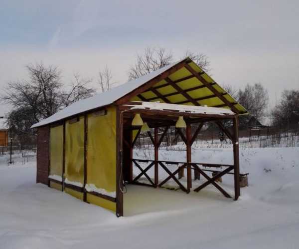Закрытая часть постройки обеспечивает защиту при любой погоде. Надежное остекление делает возможным пользования конструкцией в зимнее время. Интересно, что в ней можно устроить оранжерею, особенно, если отопление будет постоянным.