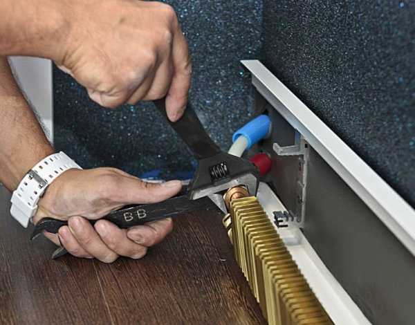 - Подключение. На этом этапе необходимо подключить электрический теплый плинтус электросети, а водяной к котлу (центральной системе) и подключить воду.