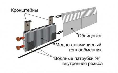 Трубопроводы вмонтированы в корпуса ребристых теплопередатчиков. За счёт ребристого строения поверхность теплоотдачи многократно увеличивается, что значительно способствует активной циркуляции нагретых воздушных масс.
