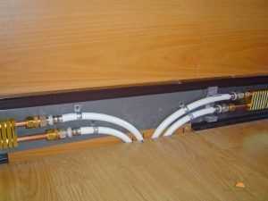 - Устанавливаем и соединяем между собой конвекторы, которые соединяются обычными обжимными фитингами. Для монтажа в углах помещения используются поворотные трубки.