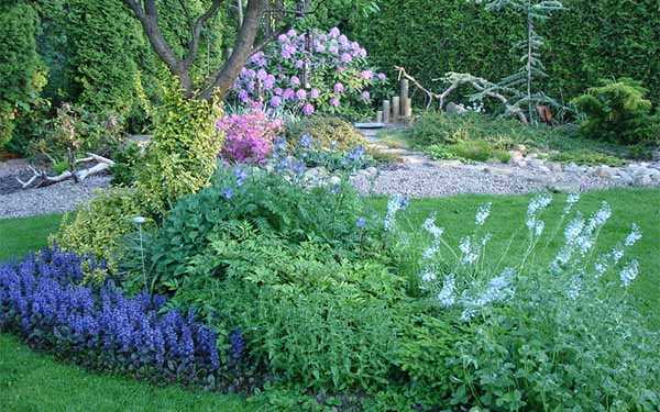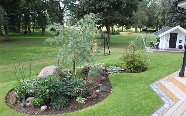 Для того, чтобы участок имел завершенный вид, на нем не должно быть пробелов. Их можно удачно заполнить многолетними кустарниками, клумбами или деревьями с высокой кроной, если они плодоносные — только в плюс. Сознательно задуманный газон пробелом не является.