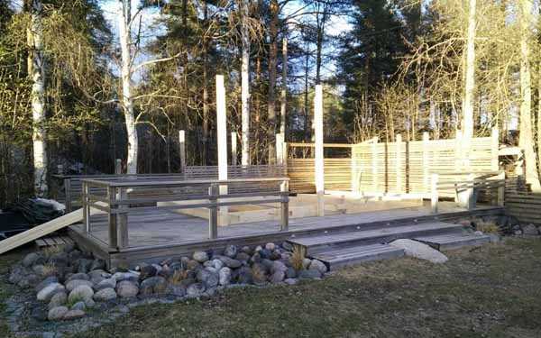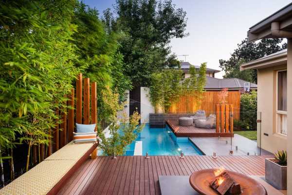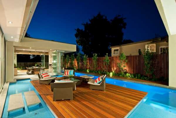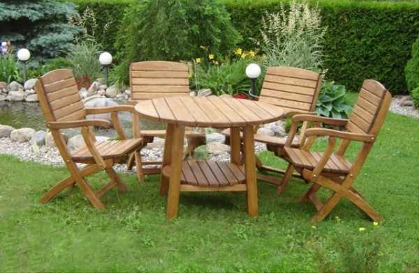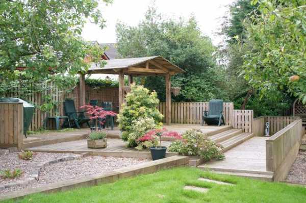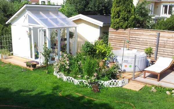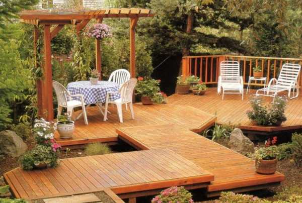 Чтобы его оригинально организовать, следует установить деревянный помост или палубы. По периметру их можно облагородить многолетними растениями. И, конечно же, приобретите садовую мебель! При этом лучший выбор для нее – это складные варианты, которые на зиму можно будет убрать и спрятать на чердаке.