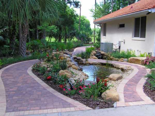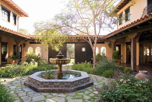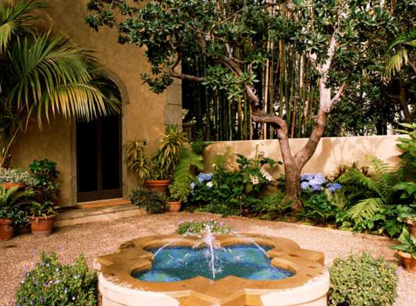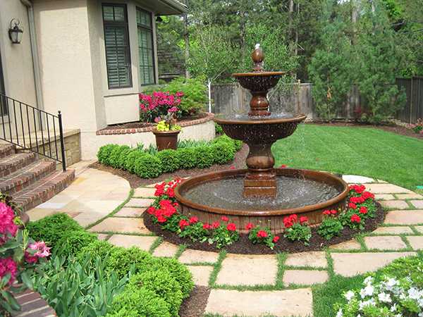 Если вам позволяют финансы, а территория довольно большая, то вы можете оформить двор по-особенному, поместив на нем фонтан или искусственный водоем. Такие конструкции довольно часто можно увидеть в ландшафтном дизайне дорогих поместий или коттеджей. Такая тенденция присуща восточному стилю, который не обходится без природных камней, растений и воды. Не зря Японцы считают, что вода — это источник жизни и символ гармонии.