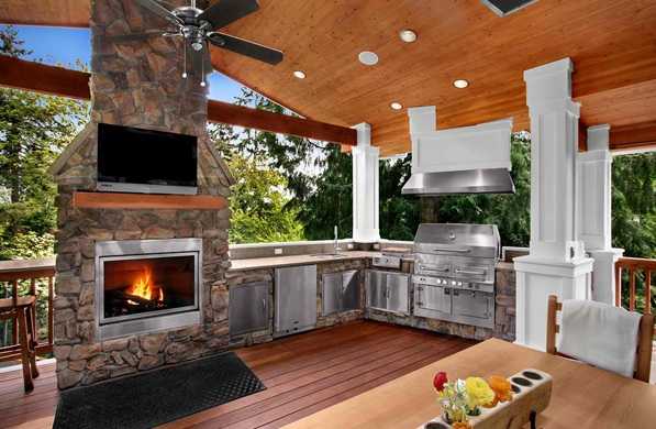 Если позволяет пространство, удачно впишется полноценная летняя кухня. Идеальным будет сочетание с крытой террасой, на случай дождя.