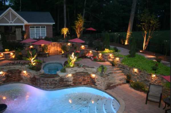 После этого уже можно разрабатывать план декоративного освещения. Можете сделать подсветку цветников, садовых скульптур, водоемов.