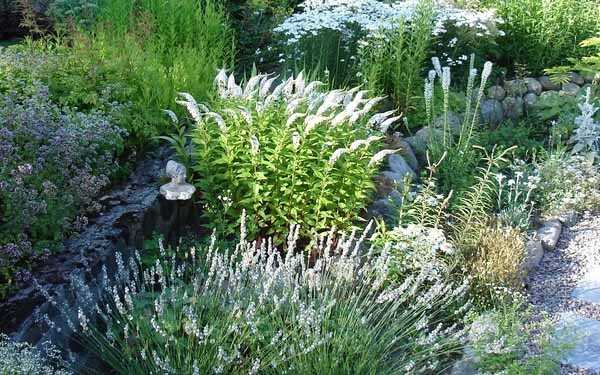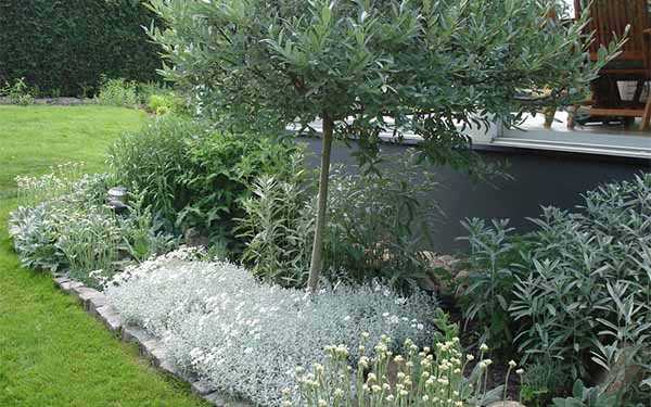 Клумба рядом с террасой в саду была сформировано в серебристых тонах — чистец, цинерария, полынь, серебристая ива. Мода на такие клумбы в ландшафтном дизайне не случайна — эти серебристые кружева будут смотреться изыскано и стильно во любом дворе.