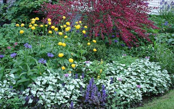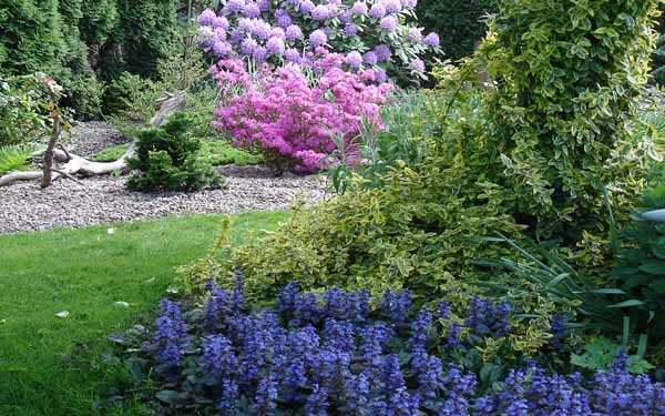 Как показала практика, самые красивые клумбы во дворе частного дома те, у которых растения высотой от метра и более. Их видно издалека и они создают основной фон в саду. Важно выбирать растения, которые сохраняют свою декоративность в течении всего сезона — идеально, если они цветут все лето, но вполне приемлемо, если после цветения листва остается аккуратной и красивой. Для основы клумб лучше всего подходят цветущие кустарники (рододендрон, гортензия, жасмин, сирень, айва, бузина) — они создают большой объем цветов и неприхотливы. Чтобы их цветение было роскошным, нужно вовремя их обрезать и подкармливать.