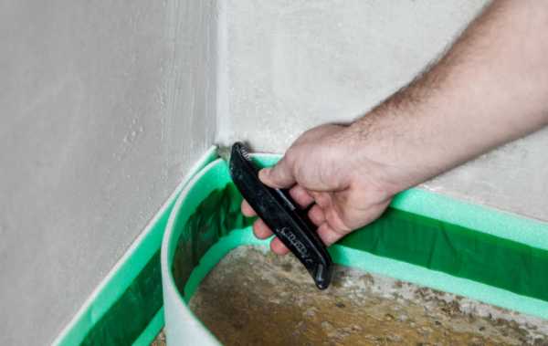 Если лента обладает клейким слоем, то достаточно ее просто приклеить по всему периметру, огибая все архитектурные формы, выступы, ниши, колонны. При наличии «юбки», ее загибают на пол, так, чтобы под нее не смогла попасть вода.