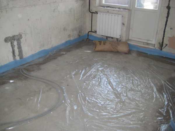 Перед всеми работами необходимо очистить площадь от мусора, и привести в порядок стены и пол (залепить трещины, например). Площадь для стяжки покрывается полиэтиленом – он вступает в роли гидроизоляции. В углах между полом и стеной полиэтилен на пару сантиметров подворачивается на стену.
