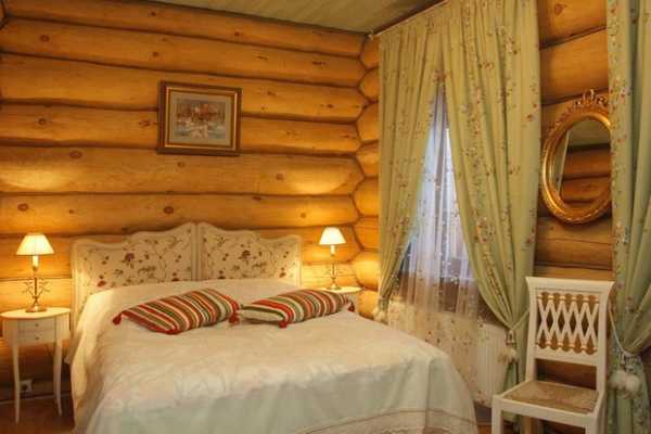 Девичью спальню в бревенчатом доме можно оформить в романтичной барской манере. Гобелены на стенах, зеркало из усадьбы, коврики и другой текстильный декор напоминают спальни русских барышень.