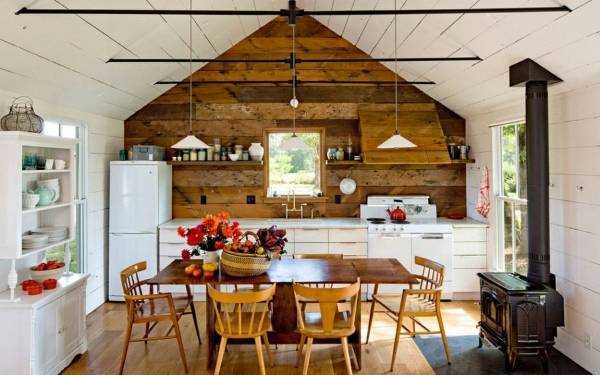 Для дачного домика отлично подойдет деревенский стиль, его часто используют в интерьере маленького деревянного дома внутри. На фото смотрится такой дизайн просто, мило и очень уютно. В последнее время такие дома стали весьма популярны, ведь они не требуют больших финансовых затрат, но в то же время практичны и удобны.