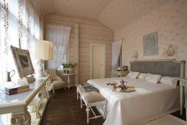 Если вы решили спальную комнату оформить в данном стиле, то на виду стоит оставить как можно больше дерева. Окна стоит украсить шторами в цветок, клетку.
