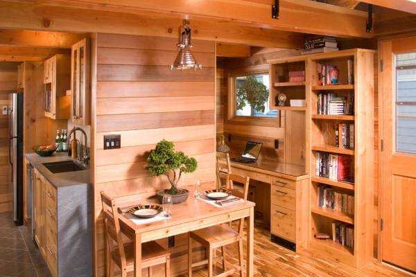 Интерьеры деревянных домов внутри помогут найти отдельные фото или фотогалерея, идеальное решение каждый хозяин выбирает сам. Планировку следует выбирать, учитывая и количество членов семьи. Если речь идет о дачном домике, который строится исключительно для летнего периода, комнат может быть немного. Главным предпочтением в жилище должны быть удобства (ванная комната и туалет), зона для приготовления пищи, спальня и мини-гостиная. Если площадь домика совсем небольшая, кухню, столовую и гостиную, как правило, объединяют в одну комнату. Кроме того, для крохотных домиков используют каждый свободный метр помещения. Если в доме имеется лестница, в ней делают выдвижные ящики для хранения вещей, холодильник прячут в свободной нише, а также используют мебель-трансформер, которую можно легко собрать и разобрать.
