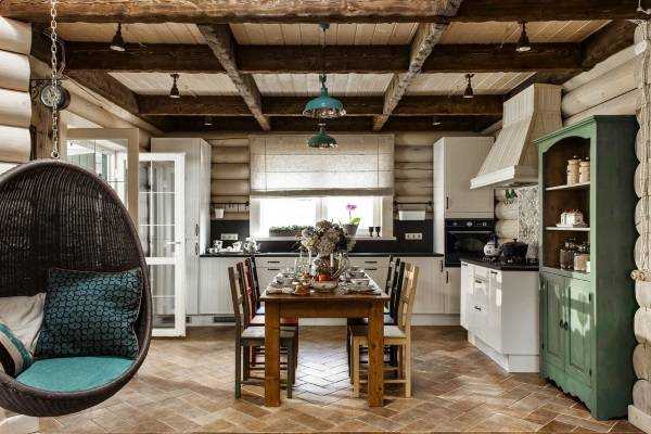 Для пола самое подходящее покрытие – не тронутый лакокрасочными материалами массив доски. Часто полы искусственно состаривают. В кухню и ванную подойдет плитка из натурального камня. Кафелем с имитацией сколов и трещин поможет создать эффект старины. Потолки тоже остаются деревянными, украшаются массивными балками.