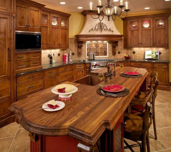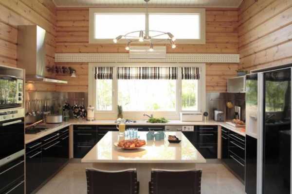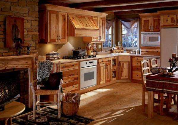 Очень эффектно в кухонном дизайне деревянных домов смотрится обстановка из натуральных материалов: дуба, ольхи, березы. Но совсем необязательно, чтобы мебель была из натурального дерева. Главное, чтобы предметы гармонично сочетались друг с другом.