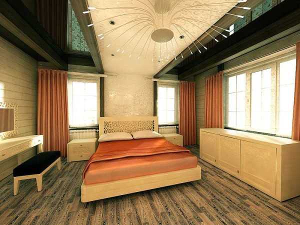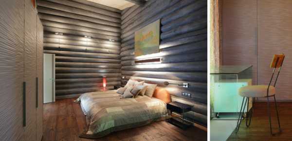 Спальные комнаты могут отличаться по стилевой направленности от стиля других помещений деревянного дома. Дизайнерские приемы те же: игра контрастов и подчеркивание деревянной фактуры. Контрасты играют не только в цветовом ракурсе, противопоставляют отчетливые формы мебели и неровности стен, нелинейную форму окна и гладкую поверхность пола.