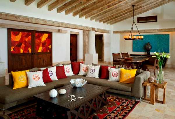 Любой из этнических дизайнов будет уместно смотреться в домах из натурального дерева, подчеркивая роскошь, комфорт и уникальность. Колоритные, насыщенные цвета интерьеров Мексики и Африки, природные материалы превратят самый простой домик в оригинальное, наполненное экзотикой жилье.
