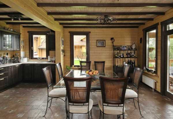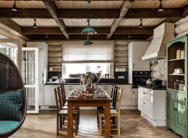 - Потолки чаще всего украшаются балками всевозможных оттенков, полы отделывают ламинатом, настилают паркет или доски, прекрасно гармонирующие с деревянными стенами.
