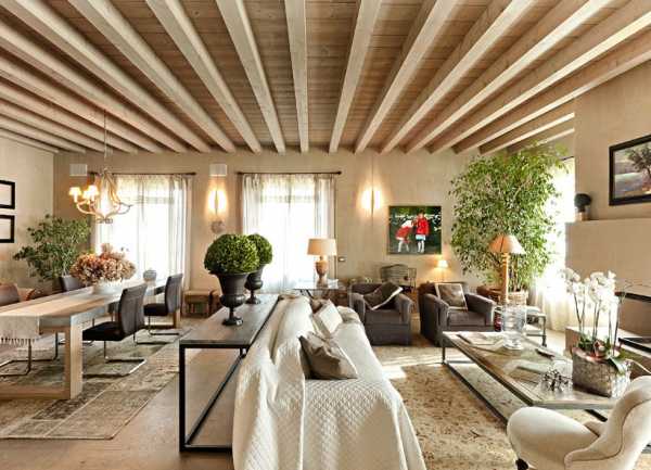 При отделке потолочной поверхности нередко используют балки, что обработаны морилкой, а потом покрыты лаком.