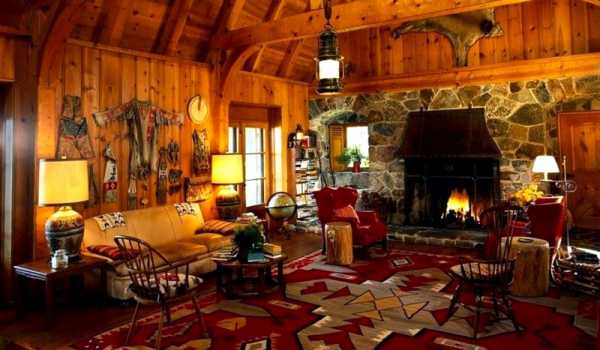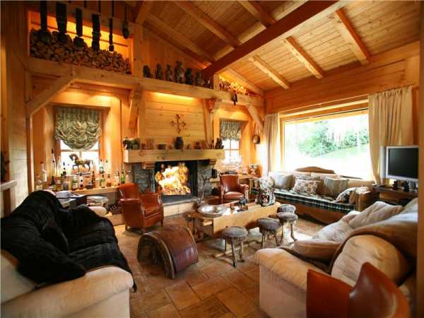 Ассоциации с домиком охотника вполне справедливы, жилье из древесины как никакое другое близко к природе. Основным украшением помещений в стиле шале будут охотничьи трофеи, чучела на стенах, большие кожаные диваны. Ковры часто замещают шкурами животных. Желательно наличие очага внутри дома. Красивые гобелены, рога животных, большие пейзажи прекрасно помогут задекорировать стены. Нельзя упустить и главные декор – ружье и прочие охотничьи атрибуты.