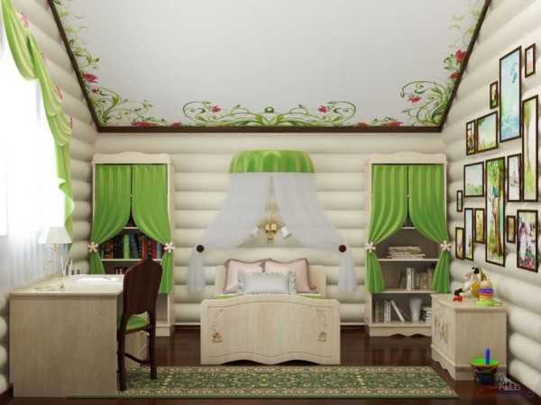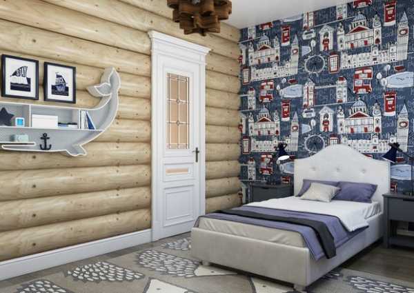 Комнаты для совсем маленьких можно оформить выбеленными бревнами, покрытыми краской на водной основе, которая четче проявляет рисунок дерева, совершенно не пахнет ни в процессе окрашивания, ни после него. Натяжной потолок голубого цвета будет имитировать небо, а яркие детали добавят радости и красок в интерьер детской.