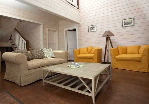 Дизайн гостиной комнаты бревенчатого дома желательно оформлять в стиле прованс или кантри. Неплохим вариантом будет и классическое направление. Синтетические отделочные материалы в виде линолеума, натяжных потолков лучше не применять, они нарушат циркуляцию воздуха в жилье. Для пола идеальный вариант ламинат или паркет. Яркие и кричащие цвета в интерьере деревянного дома будут выглядеть нелепо. Стены из дерева предпочитают тишину, покой и умиротворение, поэтому очень важно подобрать симпатичный оттенок элементов обстановки, чтобы он гармонировал с тоном стен.