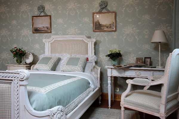 Интересным решением для этого стиля станет применение кованой мебели, плетеных стульев и столов. Кресло-качалка, вместо тумбочек старинные сундуки, кованые спинки кроватей будут выглядеть изящно и непринужденно.