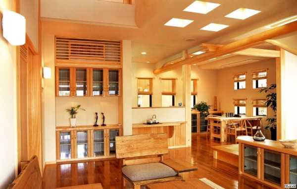 Оформление деревянного дома в духе Японии осуществляется при помощи светлой древесины. В Японии это бамбук, в России лучшей имитацией будут хвойные деревья: лиственница, сосна. Отделкой деревом подлежат все поверхности в доме: настенные, потолочные и напольные покрытия.