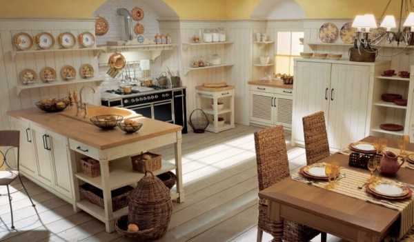 На кухне важно достичь практичности и уюта. Гарнитур может быть выполнен из дерева, стены можно оклеить влагостойкими обоями, а вот на пол лучше всего подойдет какой-нибудь декоративный камень – например керамогранит. Паркет или доска для пола на кухне являются несколько непрактичным решением, однако выбор всегда остается на усмотрение хозяина дома.