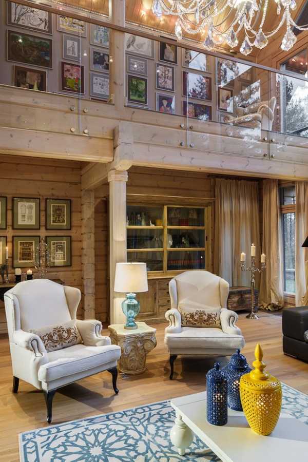 Также не стоит забывать про элементы, которые отлично подходят именно деревянным домам и делают их еще более эксклюзивными и притягательными. Картины с охотничьей тематикой, камин, мощные канделябры, колонны, старинная мебель, подсвечники и изысканные светильники придадут помещению роскошный, богатый вид. Такой дом станет настоящей гордостью хозяев и предметом для зависти гостей.