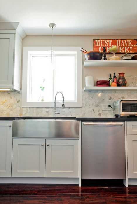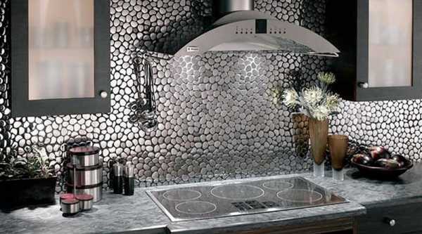 Его уместнее использовать точечно, для защиты стены возле плиты и мойки. Все остальные поверхности проще задекорировать все той же плиткой. Исключение составляет лишь изначально задуманная «стальная» концепция, но это дело вкуса.