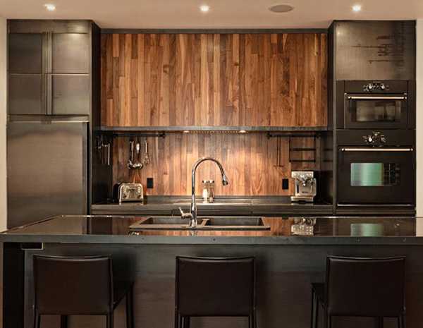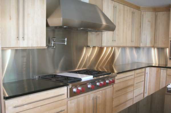 Минусы также имеются. В частности, стальные фартуки будут неуместными в малогабаритных комнатах, потому как воздушная прослойка между панелью и стеной будет неплохо резонировать, вызывая раздражающий «металлический» звук. Любое приготовление будет отражаться увеличенным гулом и стуком.