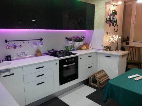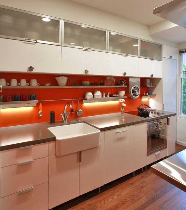 - на белом фоне будет отлично смотреться подсветка и любые кухонные принадлежности, которые можно разместить на рейлинге.
