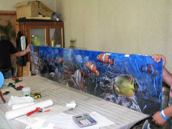 - как правило фартук из поликарбоната имеет бесцветный и прозрачный вид, поэтому под ним допустимо наличие ярких обоев с рисунком или специальную пленку имеющая фотопечать