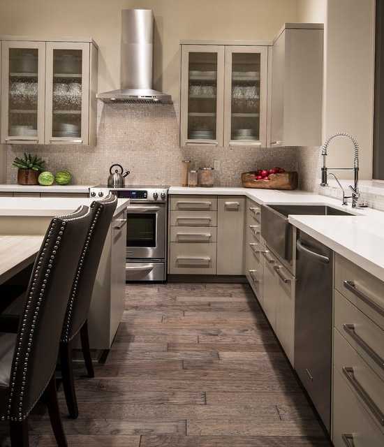 Стоит напомнить, что кухня – это не декоративная комната. Здесь все должно быть максимально функциональным. Брызги сока из бутылки, жира из сковородки, а также воды из раковины – обычное дело. То же самое можно сказать и о повышенной температуре от варочной панели.