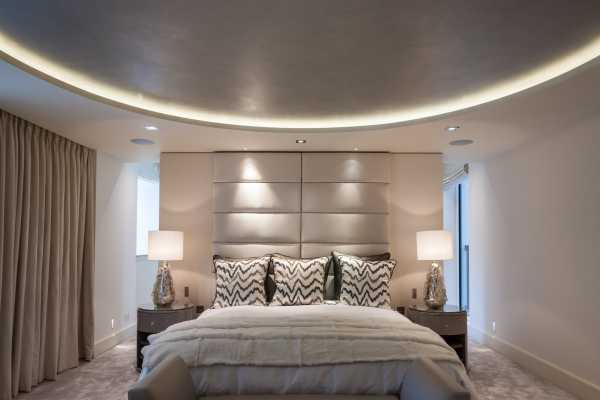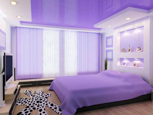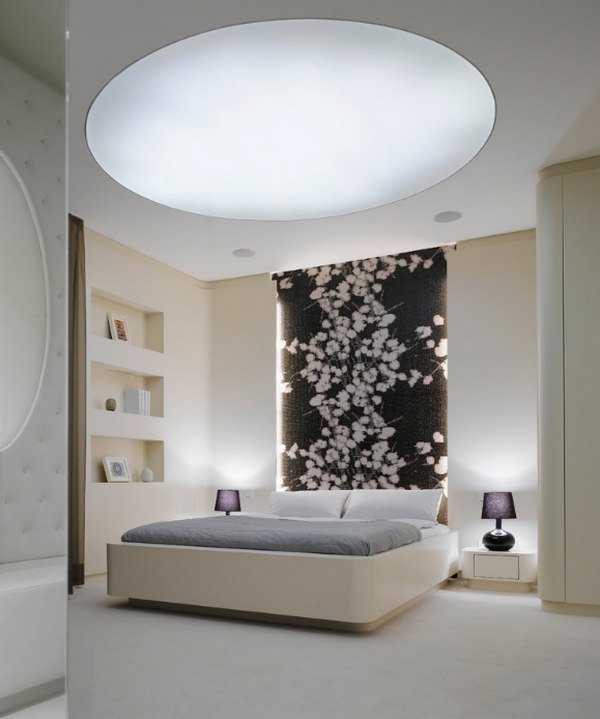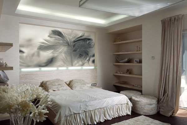 Двухуровневый потолок разбивает пространство и делает его более глубоким. - Натяжные потолки позволяют пофантазировать. На них можно нарисовать любые элементы. Светящиеся рисунки ночью выглядят просто потрясающе. Они располагают к релаксации и романтическим мыслям.