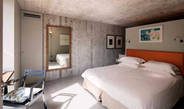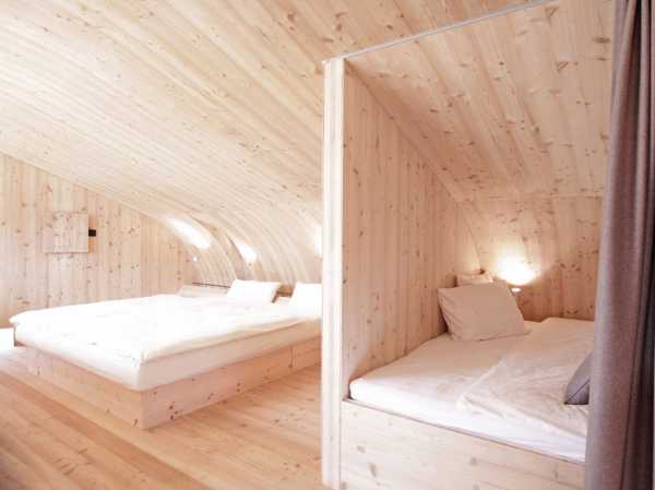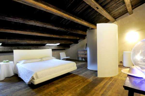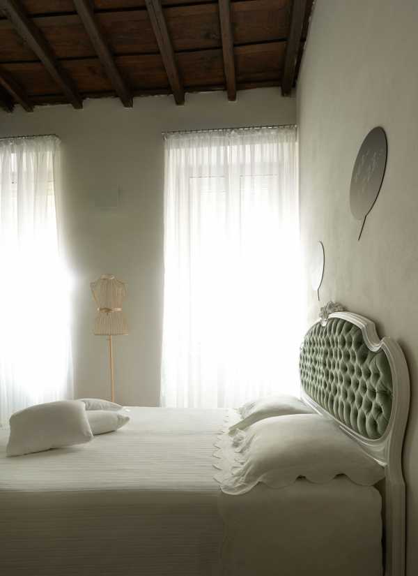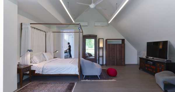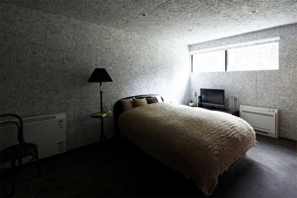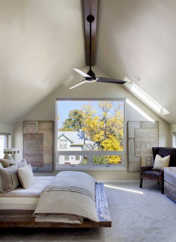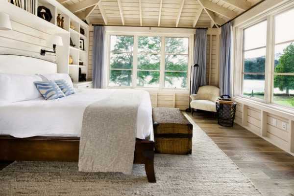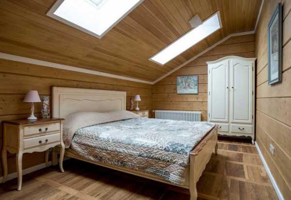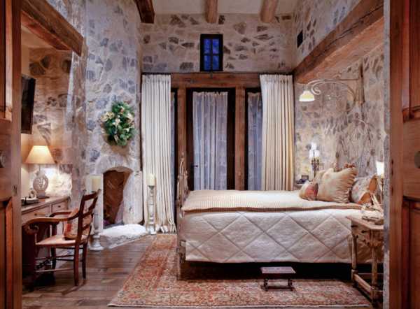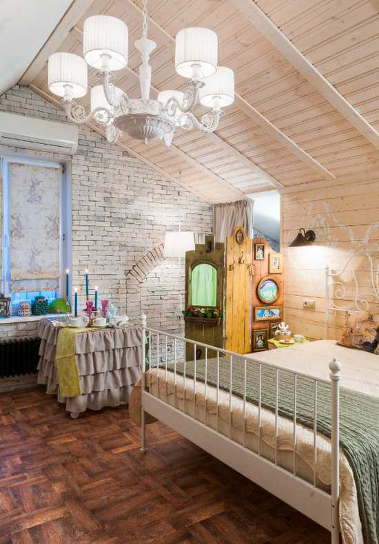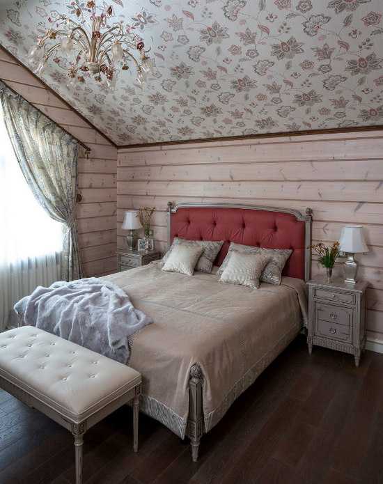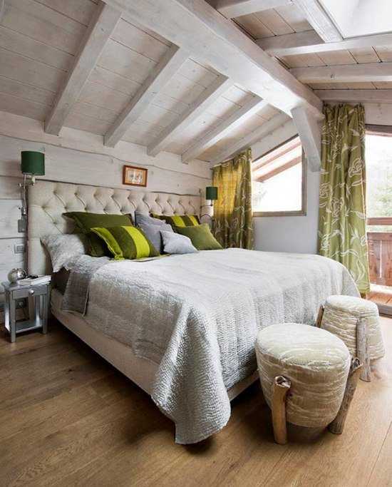 Отделка стен и потолков достаточно грубая, но это органично смотрится, если спальня находится на мансарде загородного дома.