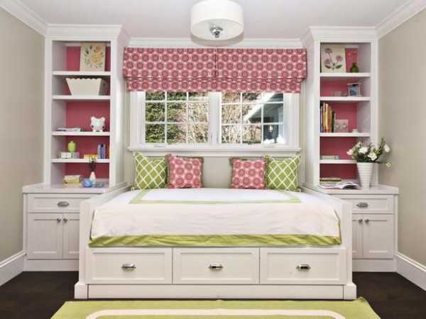 Пусть мебель в спальне будет самая компактная. Шкаф-купе и другая встроенная или выдвижная мебель занимает минимум пространства. Возможно использование компактных стеллажей. Что касается кровати — закажите ее со встроенными ящичками, в которых удобно хранить различные вещи.