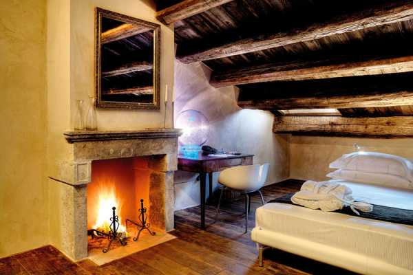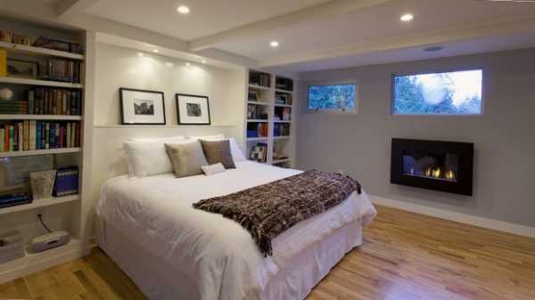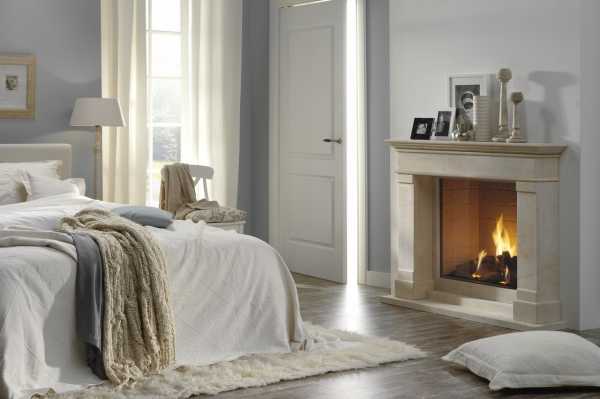 Камин гармонично впишется в общую обстановку комнаты.Освещение в спальне можно разбить на основное, дополнительное и индивидуальное. Так кроме непосредственно люстры можно использовать светильники, бра, торшеры, светодиодную подсветку.